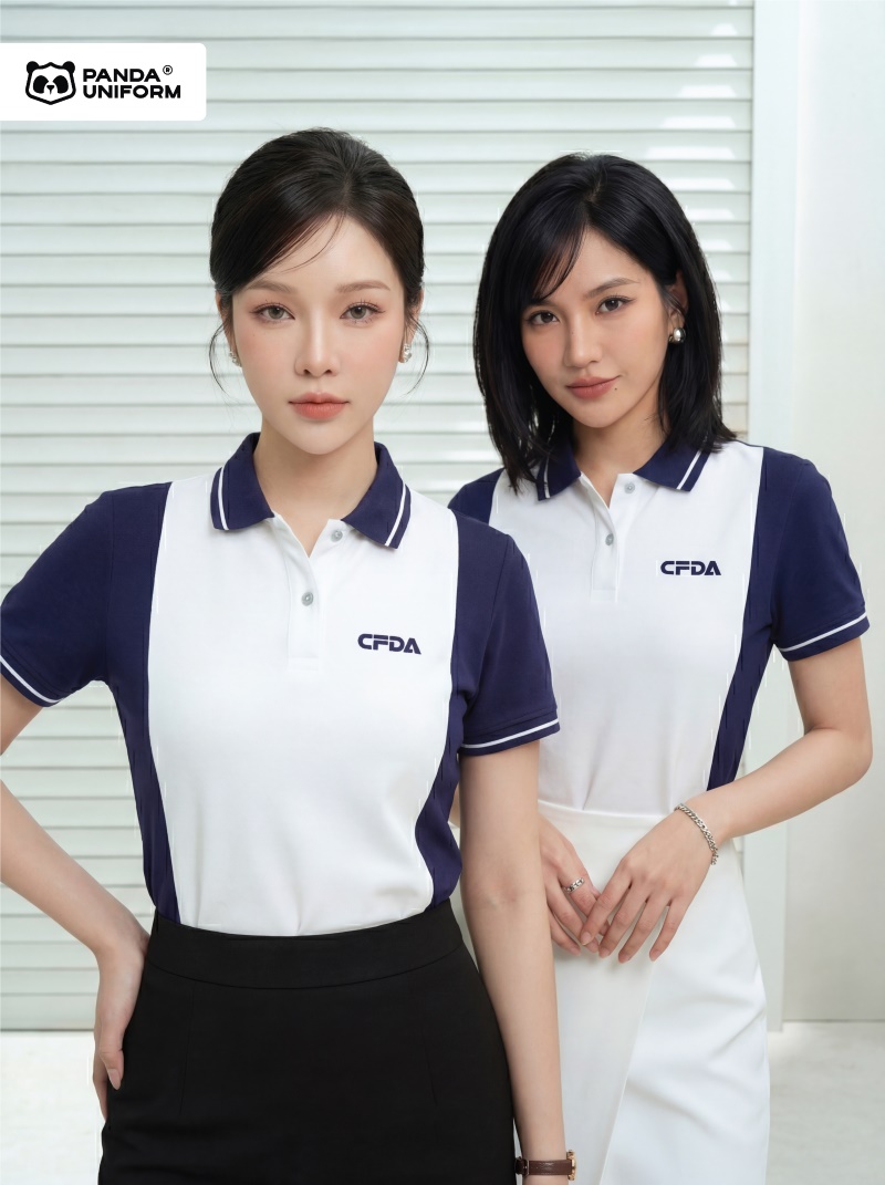 Mẫu áo polo xanh tím than phối trắng đồng phục công ty